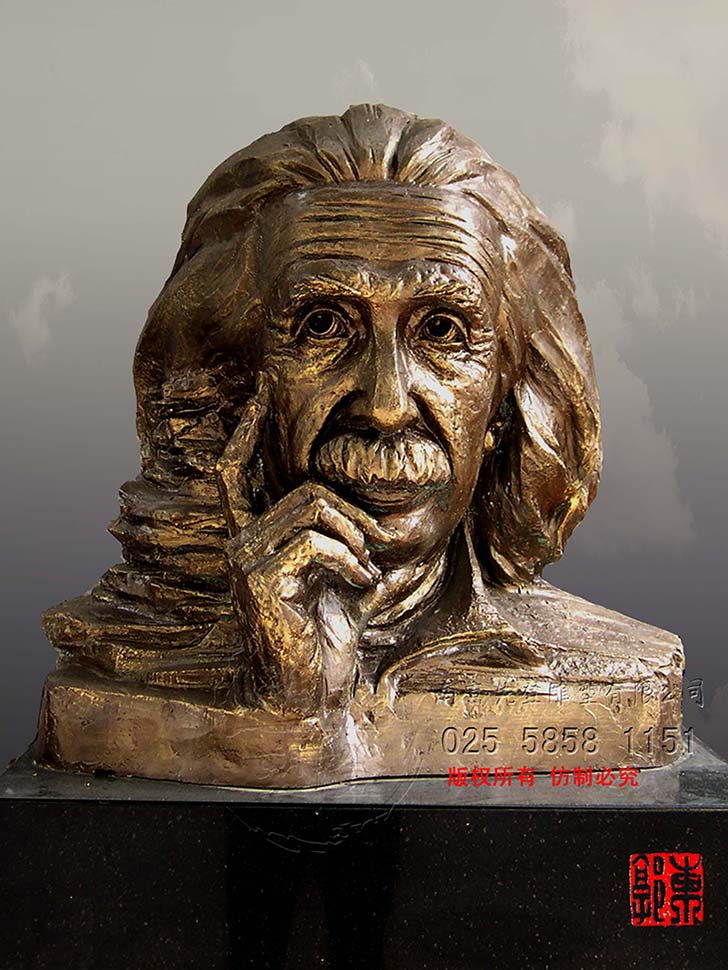 雕塑作品是雕塑家個(gè)人內(nèi)心的情感和表達(dá)欲望情感的載體、宣揚(yáng)精神層面的介質(zhì)。愛(ài)因斯坦的雕塑塑造的是智慧與仁義的結(jié)合,他的人生在不斷探索、思考中感染著人類(lèi)。藝術(shù)家索取的就是愛(ài)因斯坦散發(fā)出的人格魅力,他是世界的公民,他的愛(ài)建立在人道主義情懷之上,不屬于哪一個(gè)國(guó)度,藝術(shù)家無(wú)需精雕細(xì)琢,不是色彩的感覺(jué),是內(nèi)蘊(yùn)情感的流露,猶如匕首刺向偽君子的面具,真實(shí)的面對(duì)生活,從事嚴(yán)謹(jǐn)?shù)目茖W(xué)研究。那是什么樣的文化孕育出世紀(jì)的偉人,是什么樣的審美心理塑造出的永恒。