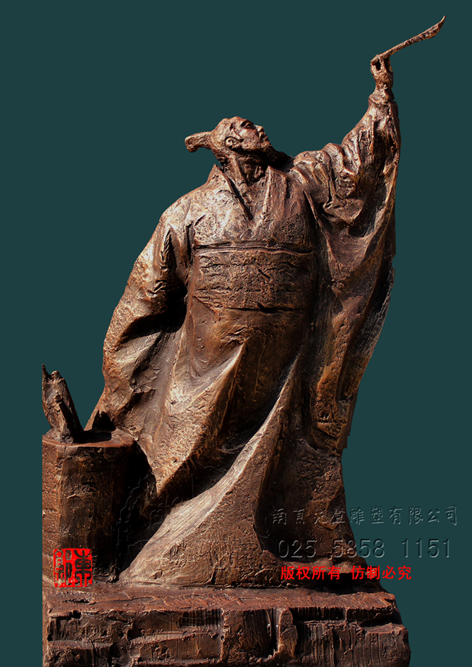 張芝字伯英,出生官宦之家,幼時(shí)高操,勤習(xí)學(xué)書,朝廷賞識(shí),令他做官,而他并非貪圖高官厚祿,甘做布衣。素日臨池學(xué)書,得崔杜之法,復(fù)而變之,遂成“今草”。張芝對(duì)書藝癡醉令人驚嘆。衛(wèi)恒《四體書勢》里有言“凡家之衣帛,必先書而后練之。臨池學(xué)書,池水盡墨。”張芝對(duì)于書法藝術(shù)的不斷索求,終成一代“草圣”,當(dāng)是“為世所寶,寸紙不遺”。雕塑里張芝如平日習(xí)作,但見他揚(yáng)手,握管,在虛空中縱姿揮毫,一如其書法,一筆而就,不拖沓凝滯,衣袍素袖宛如字之體勢婉轉(zhuǎn)流暢,舒箋觀鳥跡,研墨染魚緇。
