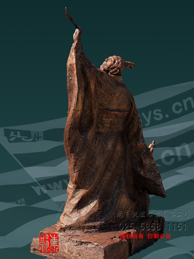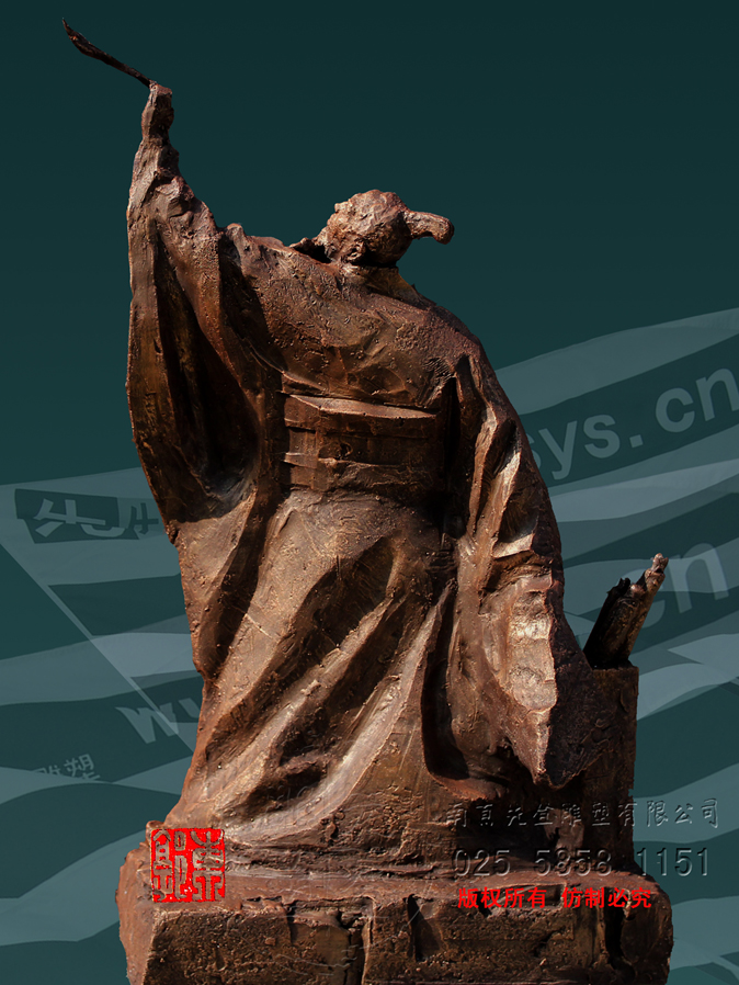 張芝日復(fù)如是,墨池水染,而筆法精湛,雕塑中東郭先生作得人物身后立有一口水甕,代指墨池,身側(cè)為書卷參差錯(cuò)落,不復(fù)你從何角度,都自成一番風(fēng)景,似有不容于世,不饗物之芳華,身在日月山川之外。都言,字若其人,觀其字,當(dāng)是一筆所成,偶有不連,而血脈不斷,字跡氣脈相通,成山川險(xiǎn)象。但又看先生雕塑,筆墨有無間,衣緇素縷暗藏儂華,轉(zhuǎn)載沉浮里,風(fēng)華涌動(dòng),通了天地的氣運(yùn),又通曉世間閭閻,真是出塵入世,字若人,行走在了日月山川里。真是人與山河并立。