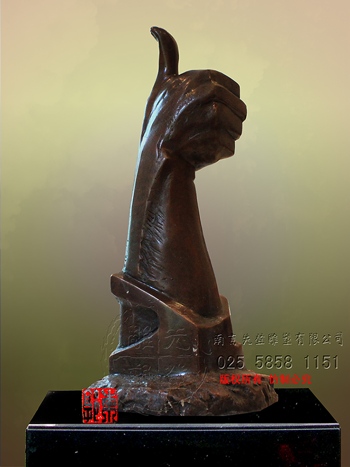 若要用一個詞來形容眼前的雕塑,莫過于“芝華士”了,沿用克里斯汀·拉科魯瓦對芝華士的評價“在我看來,有些名字,哪怕只是聽人提起或在書中偶遇,就會不自覺地將其與'聲名顯赫'聯系起來,因為這些名字本身就代表著一種品質、一種權威或者一種奢華氣質。對我而言,'芝華士'這三個字就是'時尚''奢華''尊貴'的代名詞。”一種酒何以用“奢侈”、“最貴”、“時尚”來形容?路人皆知,喝芝華士是一種享受,將酒提升為藝術,由內而外的品鑒,是一種邊緣文化潮流化,這一切不僅源于調酒師Colin Scott以及精湛絕倫的技術,而且他擁有世界頂級設計師克里斯汀·拉科魯瓦、亞歷山大•麥克奎恩。然而一尊雕塑,何以用一種酒來代稱?其實不然,芝華士的定義早已并非一樽酒而已,芝華士,享有世界蘇格蘭高級威士忌,他是外在與內在的統一,誠如雕塑所塑造的舉起的大拇指,同等的是一種邊緣文化,她需要人們鑒賞品位,需要足夠的情趣與審美素質。如同芝華士所代表的“時尚”“豪華”“尊貴”,雕塑依然具有最豪華的陣容,華麗端莊的金箔,剛毅的輪廓,以及人類機理特征所表現的自然之美,他是藝術家獨具匠心的杰作,是一樽東方的皇室威士忌,享有與芝華士同樣的尊榮。用它來界定雕塑,而且是眼前獨具匠心的雕塑,是源于其洗凈鉛華般的唯美設計風格以及其醇和出眾的口感,如雕塑從內而外,周身所散發出的氣質